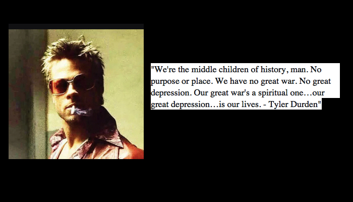 “We’re the middle children of history, man. No purpose or place. We have no great war. No great depression. Our great war’s a spiritual one…our great depression…is our lives. – Tyler Durden”