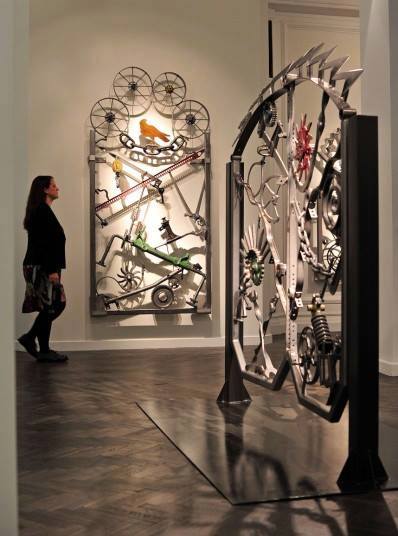 A member of the gallery staff poses next to an iron gate called ‘Untitled VI’ during a press preview event of artworks by American singer songwriter Bob Dylan, entitled Mood Swings, at the Halcyon Gallery in London Thursday Nov. 14, 2013. The exhibition of new artworks by Dylan, includes iron works alongside paintings which are exhibited and on sale from the gallery.