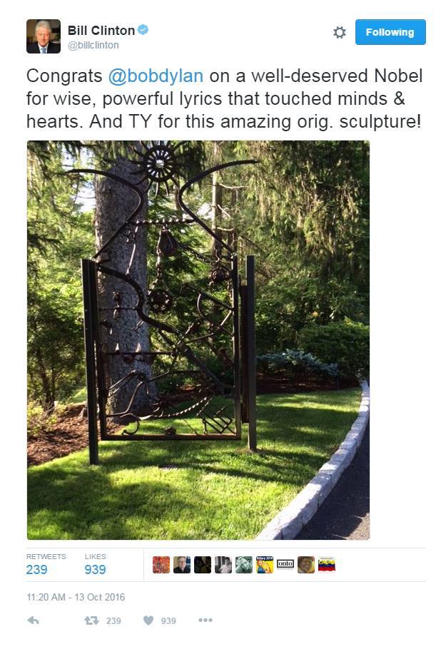Bill Clinton tweeted his Bob Dylan gate when Bob Dylan got the Nobel Prize for Literature.
